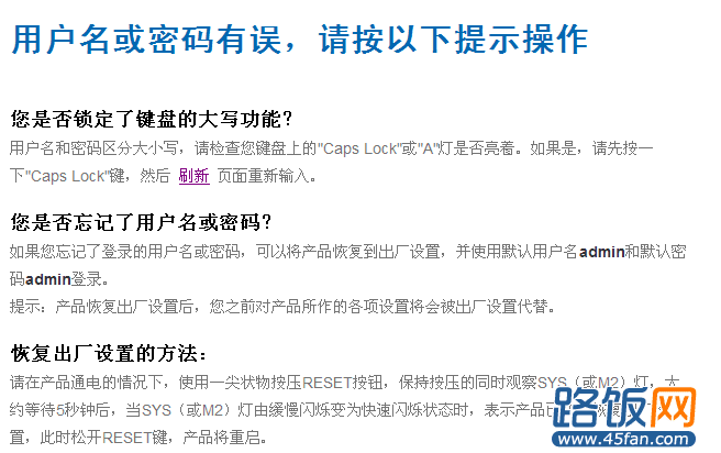 奇怪了,怎么突然进不了了呢?于是按照提示,确定字母是否大小写,确定无误后可还是无法进入。经多次测试后,最终无奈,只能恢复路由器出厂设置。