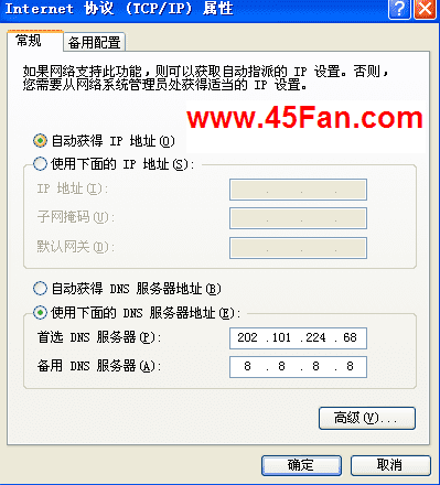 1)DNS设置方法:回到桌面,右键“网上邻居”属性-本地连接属性-Internet协议(TCP/IP),选中“使用下面的DNS服务器地址”,手工输入正确的DNS地址。如下图所示: