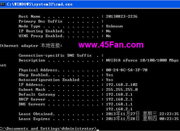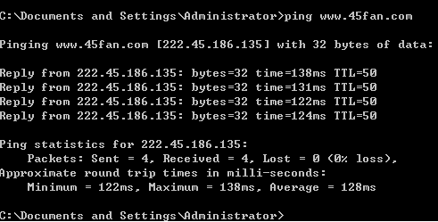 2)当然也可直接ping域名,如本站域名ping www.45fan.com,Reply from信息能直观的检测当前局域网是否与外网保持畅通,如下图所示: