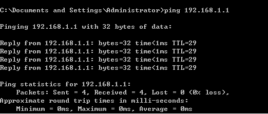 3、如果反馈Reply from 192.168.1.1: bytes=32 time<1ms TTL=29信息,则说明本机到路由器之间网络是通畅的。如下图所示: