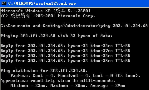 1)还是在DOS框中使用ping命令检测当地DNS,ping 202.101.224.68或8.8.8.8(Google全球通用DNS地址),如反馈类似Reply from 202.101.224.68: bytes=32 time=27ms TTL=55信息,则说明电脑可以与外网保持畅通。反之则路由器端到外网之间存在线路或其他问题,如运营商割接等。