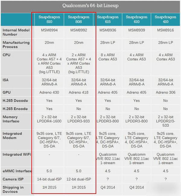 需要指出的是,Qualcomm骁龙810处理器和骁龙808处理器都采用了先进的20纳米工艺制程,而且采用64位架构。不同的是,骁龙810处理器拥有四核ARM Cortex A57 CPU和四核A53 CPU,是一款八核处理器,并配备Adreno 430 GPU。骁龙808处理器则采用双核ARM Cortex A57 CPU和四核A53 CPU,搭配Adreno 418 GPU,是一款六核处理器,整体性能方面略逊一筹。