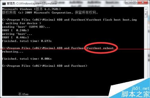 3、输入此命令重启手机:fastboot reboot