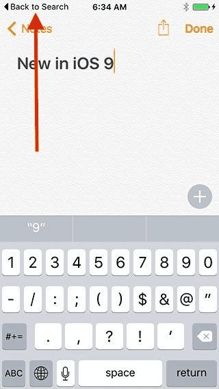 在iOS9中,如果你从全新的Spotlight或者是通过横幅通知打开应用的话,左上角将会出现“Backtoxxx”的提示,点击即可返回上一个应用或Spotlight搜索界面。