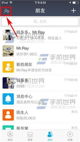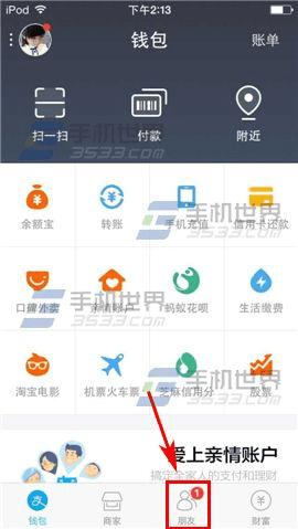 1)打开手机支付宝,进入首页后点击【朋友】按钮,进入朋友页面,点击左上角的【人头像】。(如下图)