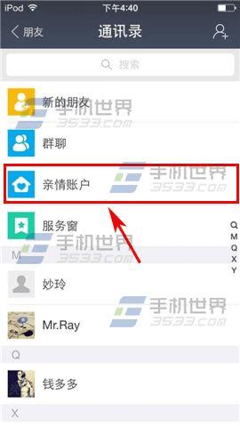 2)进入通讯录,点击【亲情账户】,接着选择一个【亲情关系】。(如下图)