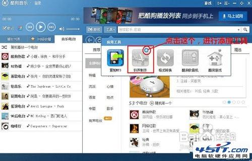 2.下载安装后,打开酷狗2012软件,在中间有个工具栏,点开可以看到有个“铃声制作”工具,现在呈灰色状态,点击图标右上角的加号则可进行下载。