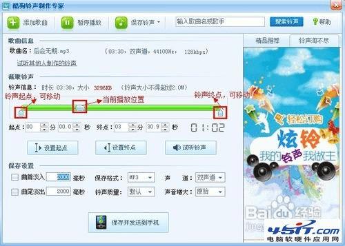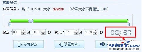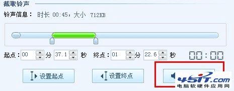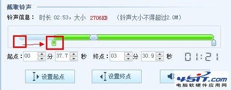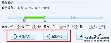 认真地听这首歌,然后到需要的铃声片段开始的地方,点击“设置起点”按钮,则铃声起点标识也会自动进行时间的调整设置。到结束后,点击“设置总店”按钮,铃声起点标识也会自动进行时间的调整设置。