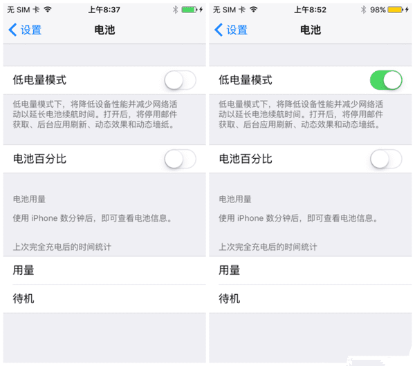 另外,iOS9的低电量模式虽然强化了续航能力,代价则是暂停部分功能的后台运行,比如邮件收娶后台应用刷新以及动态效果和动态壁纸。