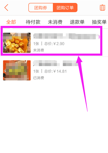 5、在我们的团购订单里面,可以看到所有历史订单,包括付款的,未付款的,已经消费的等等。温馨提醒一下,只有未消费的订单才可以申请退款的哦。所以我们找到想要退款的那个未消费的订单,点一下打开它。