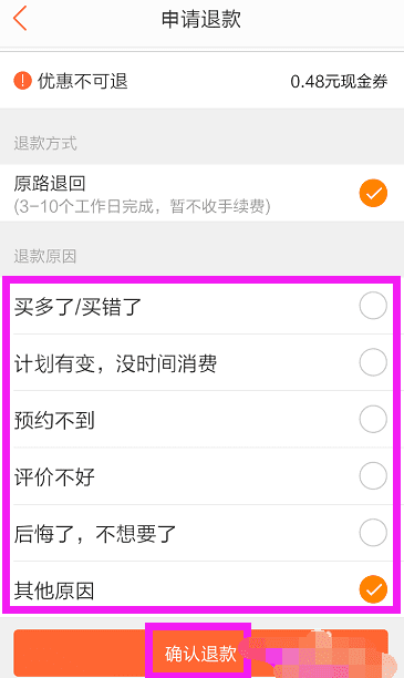7、在“申请退款”的手机界面上,滑动一下自己的手机屏幕到底下,在“退款原因”里面勾选中其中一个原因,再点下面的“确认退款”。