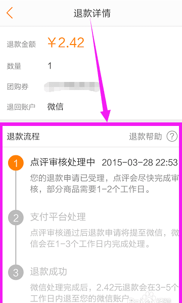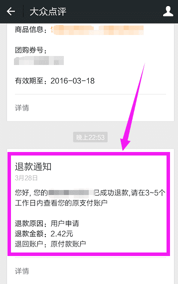 11、等我们收到大众点评的“退款通知”和一个短信通知,我们就可以去查看自己之前付钱的账号,是否已经退回钱啦。钱到帐,就表示我们的退款成功啦。