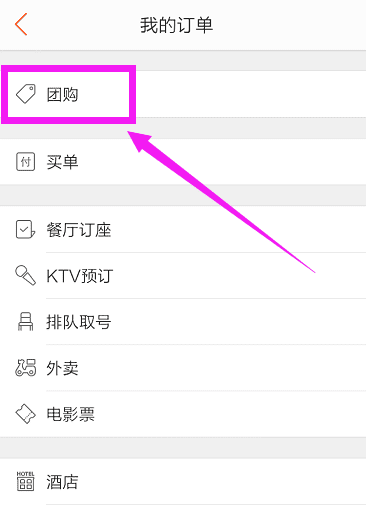 4、打开了“我的订单”的手机界面之后,点一下第一个“团购”。