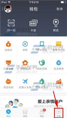 1)打开【手机支付宝】,进入首页后点击【财富】按钮。(如下图)