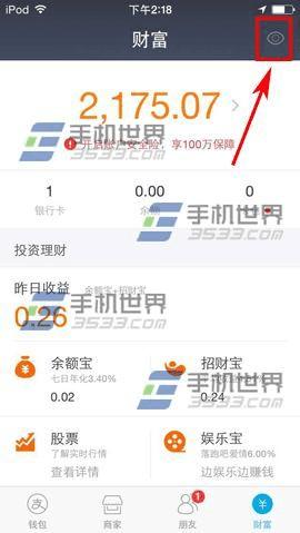 2)跳转到财富页面后,点击右上角的【眼睛】图标,可以看到“眼睛”闭上了,这是财富明细就可以隐藏了哦。(如下图)