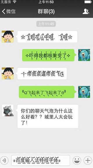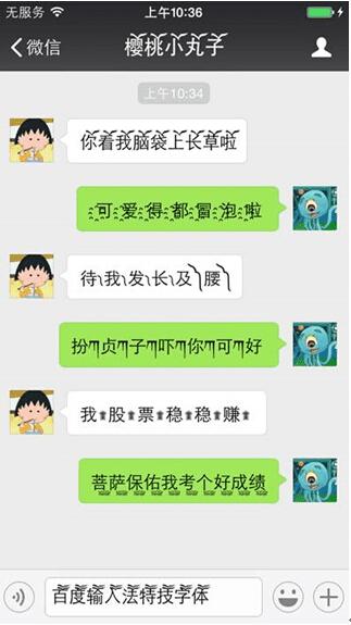 为了给用户增加更多惊喜,提升输入法的愉悦体验,百度输入法iOS新版还别出心裁地推出了独家的凌乱特技字体,例如用户使用了“凌乱特技の单字变变变”效果,则在输入时每个字的特技都不一样,除了随机更换特技效果以满足用户时刻寻求变化的新鲜感外,也让用户的聊天内容更加引人注目,同样的内容打出了不一样的效果。