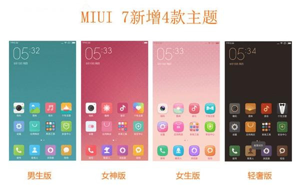 随着小米手机使用人数的增多,喜欢为小米“发烧”的用户也不单纯只是理工男了。因此,MIUI 7中增加了4款全新的主题,可在开机设置界面中直接选择。分别是男生版、女生版、女神版以及轻奢版。并且每款主题的图标都进行了重新绘制。