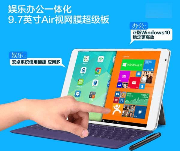 9.7英寸2018*1536视网膜屏幕、英特尔 Bay Trail-T Z3736F 处理器、2GB内存、500万/200万像素双摄像头、8500mAh电池,最大128GB扩展存储支持。