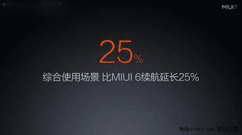 此外,MIUI 7还对最热门的500款App量身优化,限制应用后台不必要地使用WiFi、数据网络或位置服务;并且缩短数据网络连接链路时长,降低无数据传输时手机与基站的连接功耗,通过全面优化后台省电,MIUI 7的系统续航延长25%以上。