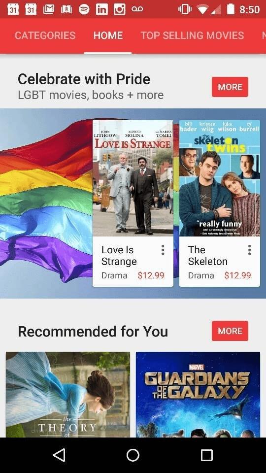 GooglePlayGoogle商店中的音乐、电影、书籍等主页面,全部显示同性恋艺术家或同性恋故事相关的作品。