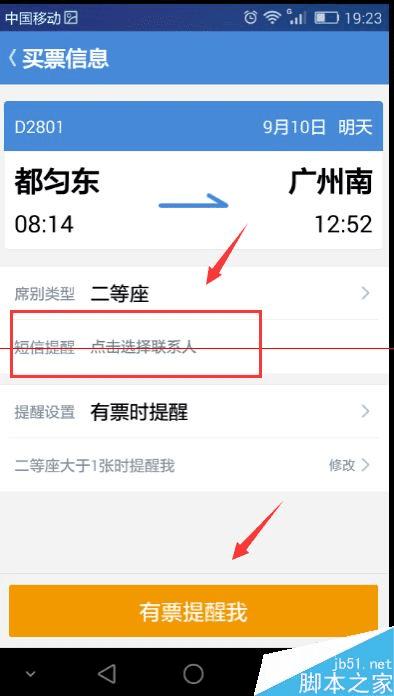 5、如果选择【有票闪电提醒】,就进入该页面,在这里可以更改席别类型,在短信提醒那输入自己的手机号,有票会给你发短信,然后点击【有票提醒我】
