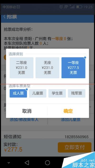 9、可以选择席别、选择车票类型,然后点击【确定】,在选择【立刻支付】。在这里我对实付款进行说明以下,如果你选择的是卧铺,那么是按照下铺进行计算的,如果你抢到的不是下铺,就会把差额部分退到你的账户。