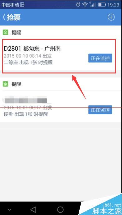 6、然后就弹出如图界面,可以看到刚才设置的提醒正在监控,你可以对你设置提醒的车次、时间、席别等进行复核