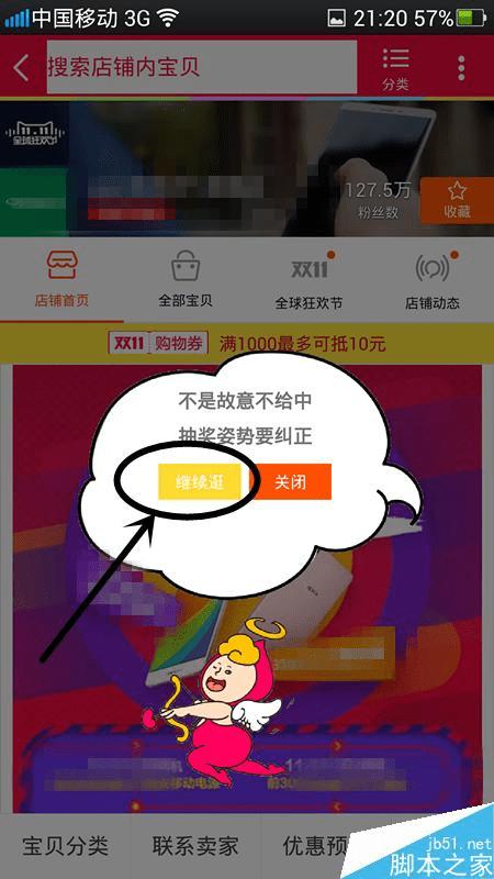 3、第一个获得红包的方式是任意进入一个品牌店,比如下方这个,在右侧会看到此次的中奖标志,点击进入就是抽奖页面,看是否有现金红包或者是未拆红包或者是购物券,没有的话就选择【继续逛】即可。