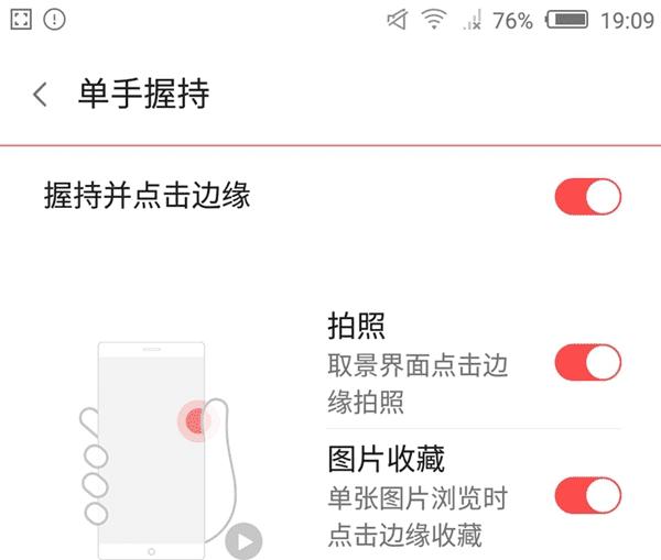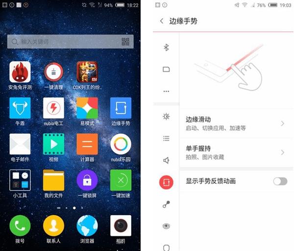 nubia z9 mini精英版提供了“边缘滑动”“单手握持”两大手势,相比Z9减少了一项“横屏双手握持”手势,其作用就是四指同时放到边框上来启动相机,应该是Z9 mini精英版没有采用2.5D玻璃、完成该动作比较吃力的原因,所以官方将之取消了。