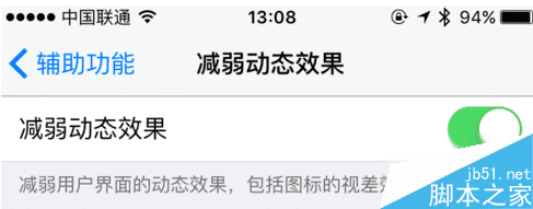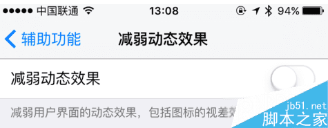 1.个人在使用 iPhone6s 时,当前也是升级到了最新的 iOS9.1 版本,记得在此之前也遇到过动画效果消失的问题。不知道是系统的问题,还是与一些第三方软件的兼容性出现的问题。当出现这个问题以后,就跟在系统关闭了动画视觉特效一样。如下图所示,当在系统中打开了【减弱动态效果】选项以后,在解锁、返回应用程序时便看不到过度的动态效果了。