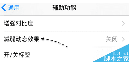 2.当 iOS9 出现动画效果消失的问题时,此时在进入【设置-通用-辅助功能】列表中,可以看到有一个【减弱动态效果】功能,如图所示