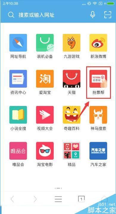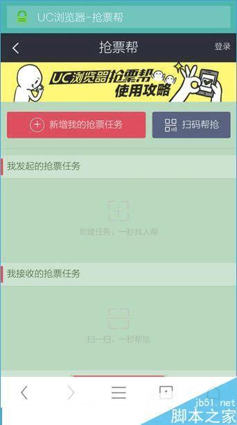 1、第一步:打开UC浏览器,选择抢票帮(注:需要事先准备好铁道部12306网站的账户密码进行登录)。