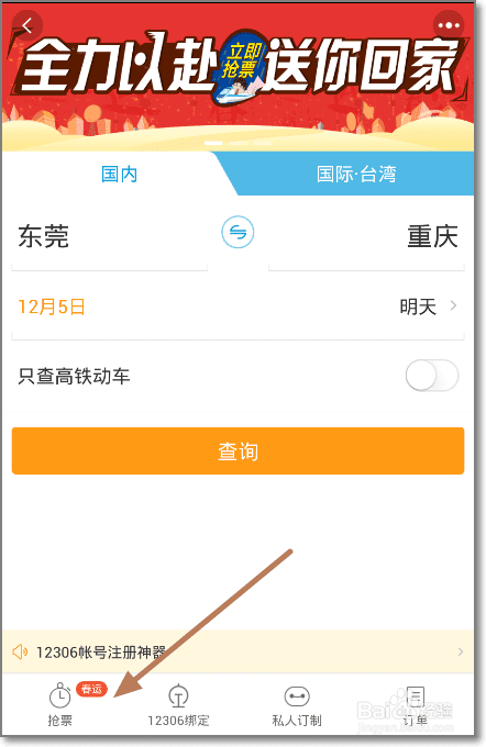 2、除了手工直接查票并购票火车票外,点击左下面的抢票。