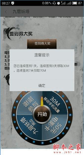 3、继续在活动页面下拉,点击签到得大奖,即会提示你连续签到3天领取30M,连续签到7天领取70M哟。