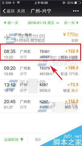 2)选择【火车票】,编辑车票信息后点击【火车查询】。接着选择拍【班次】。(如下图)