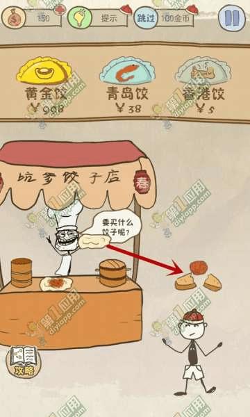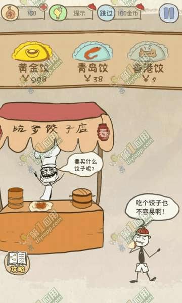 吃个饺子过个好年!摇手机出现馅,把老板手里的皮拖到馅上就可以过了。