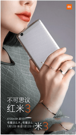 1月12日小米网现货首发,喜欢吗?”因此,红米3将采用4100mAh超大电池,作为一款入门机来说还是非常值得表扬的。