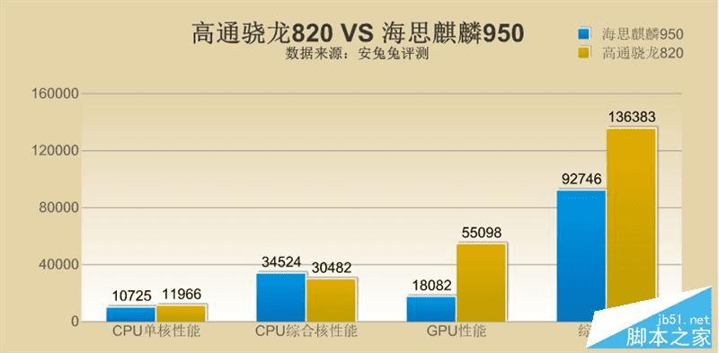 综合跑分成绩:高通骁龙820成绩(136383)>海思麒麟950成绩(92746)