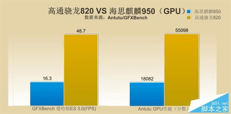 GPU性能:高通骁龙820成绩(55098)>海思麒麟950成绩(18082)