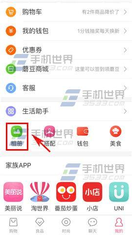 1)打开蘑菇街,点击右下角的【我的】然后点击【相册】;(如下图)