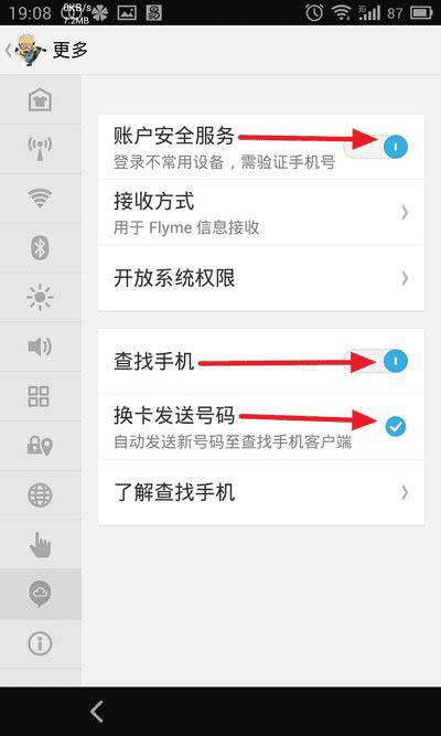 要想使用先进的Flyme安全功能,请去魅族官网下载最新的Flyme固件升级。这样才能获得最新最完整的安全功能,例如最新加入的换卡发送号码功能,手机一旦插上其他SIM卡,就会偷偷发送新号码到设定的手机号里。