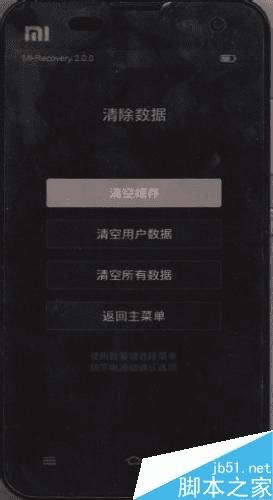 依次对“清空缓存数据”、“清空用户数据”、“清空所有数据”进行操作一次,确保清除干净。(注意:音量上下键表示选择键,电源键表示确认。)