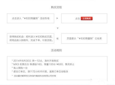 据了解,此次,“魅族630限量购”活动专场将在6月30日中午12点于魅族官网在线商店准时开启。届时,将会以630元的低价将是魅族MX3联通版16GB,提交订单后在72小时内完成付款。