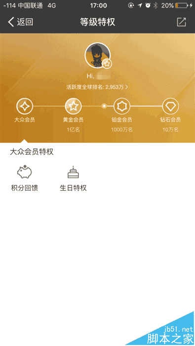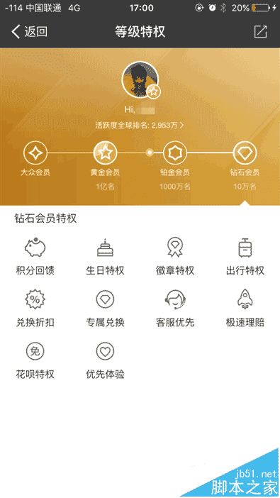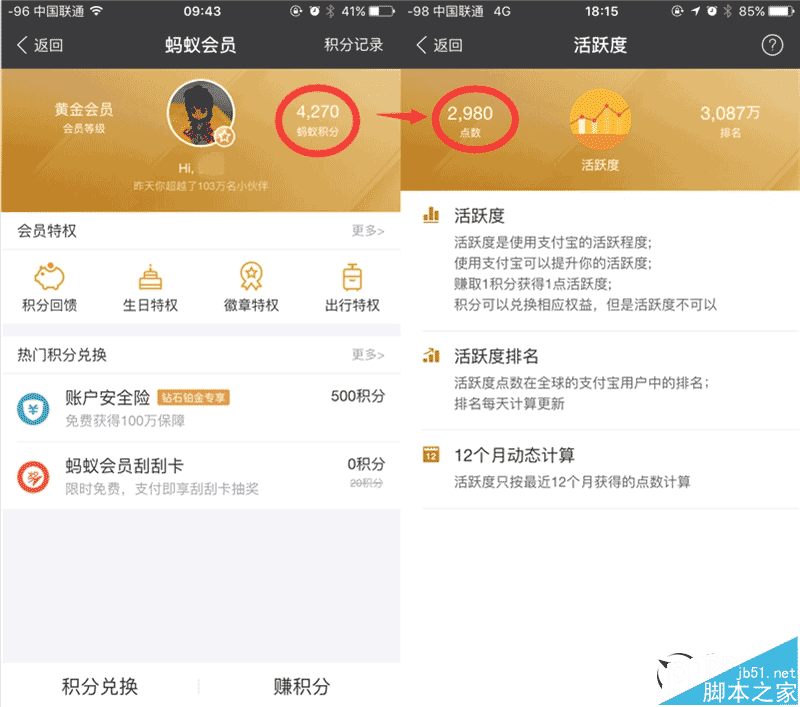 我们整理了一下,发现这四个等级与“活跃度排名”直接相关。活跃度是使用支付宝的活跃度,简单来说,使用支付宝消费可以获得积分,1积分可获得1点活跃度,但活跃度只按最近12个月(动态365天)获得的点数计算,每天更新一次。消耗积分活跃点数不会减少。