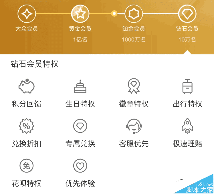 从上面几张图来看,不同等级会员享有的特权是非常悬殊的,比如大众会员仅有2个,黄金会员有5个,铂金会员有6个,而钻石会员高达10个。更高等级会员包含次等会员的所有特权。