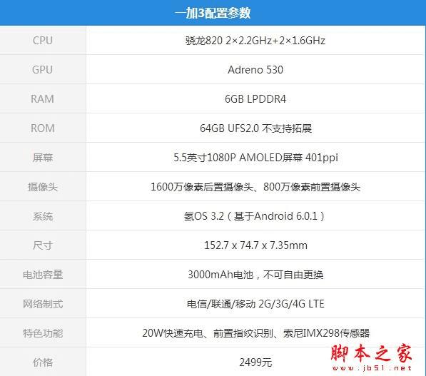 另外,一加手机3支持双卡双待全网通/4G+/VoLTE,预装基于Android 6.0的氢OS系统,支持指纹识别功能(前置,非按压式,可微信/支付宝指纹支付),支持NFC,机身尺寸为152.7x74.7x7.35mm,重158g。