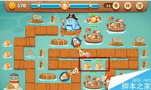 2、迅速把船锚升满级,清四周障碍。接下来就是不断的赚钱建塔了。建塔时一定要搭配蘑菇,蘑菇可以使怪物行进速度减慢,很有用。