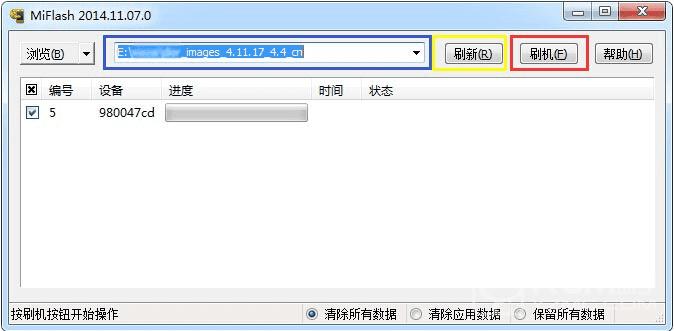 点击黄色圈选部分刷新,刷机程序会自动识别手机,点击红色圈选部分刷机开始刷机。