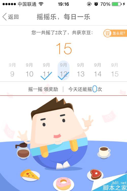 6、完成了摇一摇后,就可以领到一定数量的京豆了,但是每天只有一次机会哦。另外需要说明的是京豆的存量时间的一年,所以攒多了要注意使用哦,避免浪费了每天签到。
