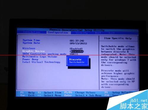 3、此时在BIOS中调整为仅使用独立显卡,具体如下图所示,部分型号的BIOS的设置方式可能不同,图中给出的V460的设置方式,选择其中的discrete,然后按F10,选择YES即可。